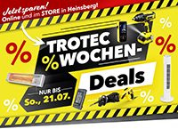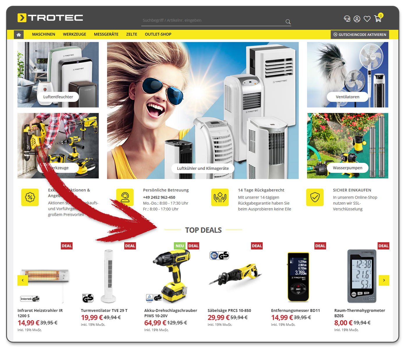 SO FINDEN SIE IHRE DEALS IM ONLINE-SHOP:Auf unserer Startseite im Online-Shop de.trotec.com/shop werden Ihnen alle „TOP DEALS“ angezeigt. Navigieren Sie einfach mit den Pfeilen nach „rechts“ und „links“ und Sie finden alle aktuellen Deals. |