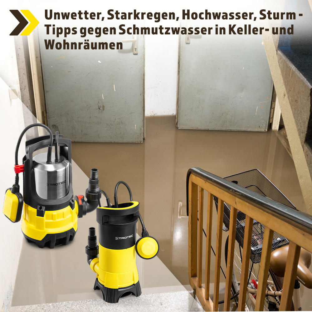 In Kellerräume eingedrungenes Hochwasser ist in der Regel stark verunreinigt. Deshalb empfiehlt sich der Einsatz von speziellen Schmutzwasserpumpen, die unempfindlich gegen größere Partikel und Fremdkörper im Wasser sind. Trotec bietet gleich drei besonders robuste und leistungsstarke Schmutzwasserpumpen aus der TWP-Serie an, die jeweils den Restwasserstand auf eine Absaughöhe von 35 mm reduzieren:
