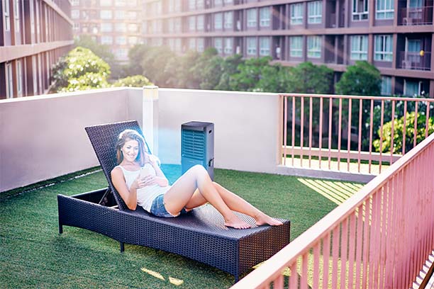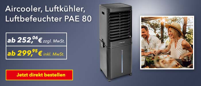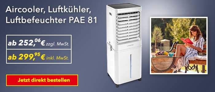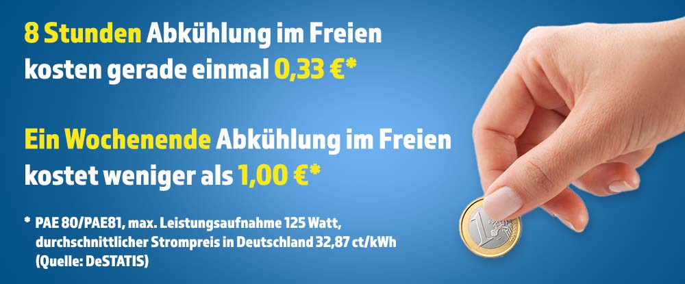 Mit diesem unschlagbaren Kühlprinzip machen die Luftkühler PAE 80 und PAE 81 selbst die aktuellen Rekordtemperaturen jenseits der 40-Grad-Marke im Freien erträglich. Der eisig frische Luftstrom sorgt für eine unvergleichlich belebende Abkühlung, ohne dabei die Stromrechnung in die Höhe zu treiben. In heißen Urlaubsländern wie Dubai oder den Kanaren gehören Verdunstungskühler im Außenbereich schon längst zur Standardausstattung. Mit den mobilen Luftkühlern PAE 80 und PAE 81 holen Sie sich diesen angenehmen Luxus zu sich nach Hause in den Garten, auf den Balkon oder die Terrasse.