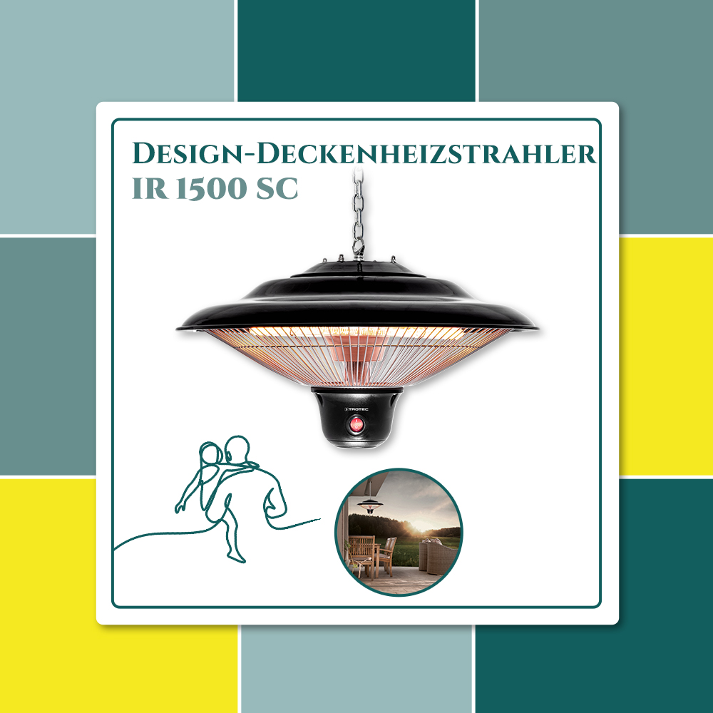Der IR 1500 SC ist ein hochwertiger 1.500 Watt Infrarot-Deckenheizstrahler mit drei Heizstufen für die Terrasse, den Balkon oder Pavillon – wo auch immer im überdachten Außenbereich eine schnelle und angenehme Sofortwärme benötigt wird.