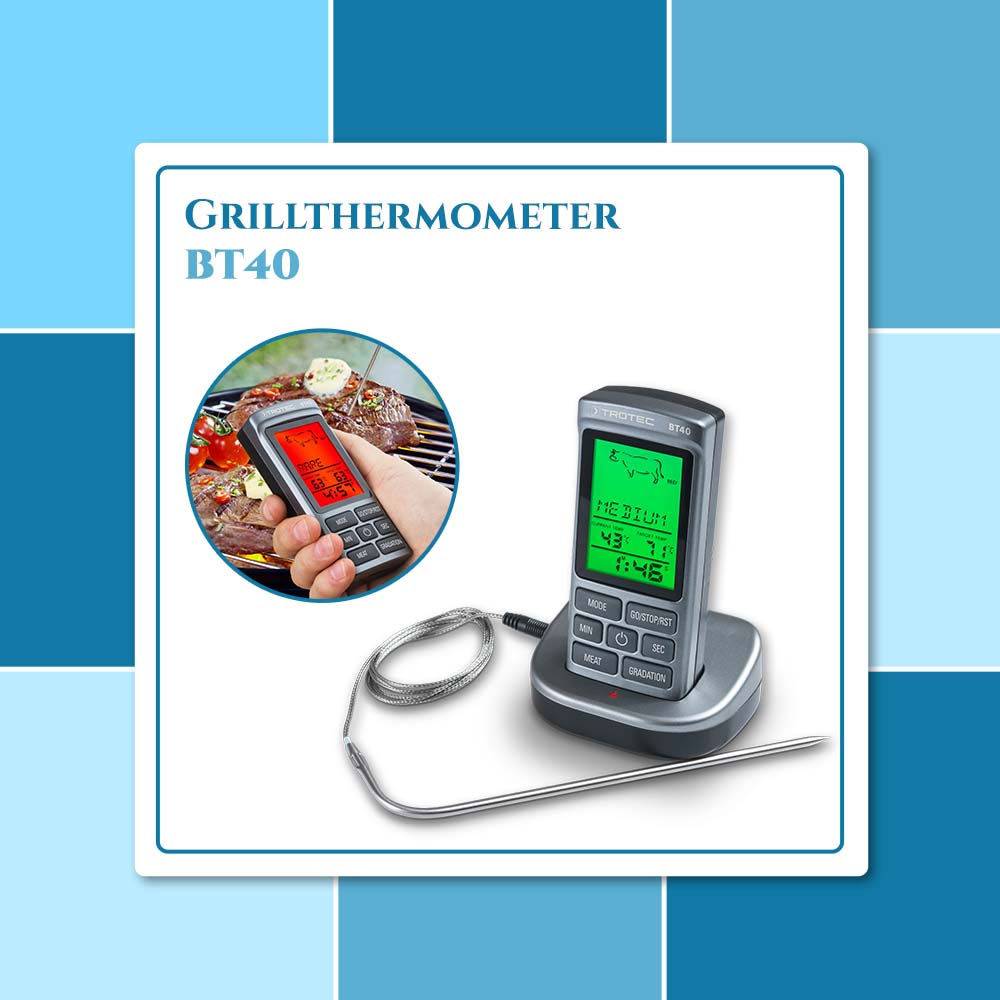 Mithilfe des kabellosen Grillthermometers BT40 von Trotec kontrollieren Sie im Handumdrehen die Temperatur Ihres Grillguts. Auch für Lebensmittel, welche auf dem Herd oder im Backofen zubereitet werden, kann das BT40 zur Temperaturkontrolle genutzt werden.