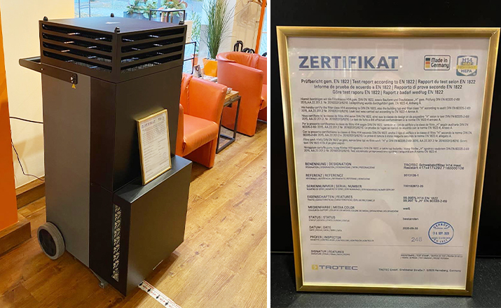 Sogar noch übertroffen werden diese von Prof Kähler definierten Kriterien vom mobilen Hochleistungsluftreiniger TAC V+. Entwickelt und gefertigt wird das Gerät in Deutschland (Heinsberg) – ausgeliefert wird es in die ganze Welt. Eine stets aktuelle Übersicht auf der Unternehmensseite, welche Restaurants, Behörden, Schulen oder medizinischen Einrichtungen den TAC V+ Hochleistungsluftreiniger bereits einsetzen, unterstreicht die erprobte Wirksamkeit der TAC V+ Luftreinigung.