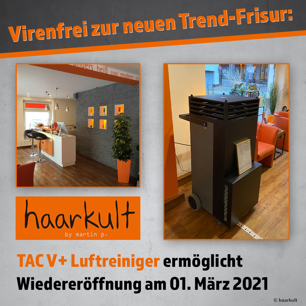 Wenn der Friseurmeister Anfang Februar seinen Laden wieder öffnen darf, wird ein TAC V+ Hochleistungsluftreiniger seine Mitarbeiter und Kunden vor dem Coronavirus schützen. Zumindest vor den Viren, die für das Auge unsichtbar in Form von Aerosolgemischen in der Luft schweben und über die Atemwege in den Körper gelangen. Denn vor diesem Übertragungsweg – nach Expertenmeinung der Hauptüberträger des Coronavirus SARS-CoV-2 – schützen weder Einwegmasken (die auch das haarkult für seine Kundinnen und Kunden im Laden als Service vorhält) noch häufiges Händewaschen.