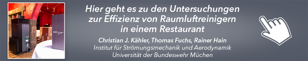 Dass das Ansteckungsrisiko in Restaurants durch den Einsatz von TAC V+ Luftreinigern erheblich reduziert werden kann, hat Kähler im Rahmen einer wissenschaftlichen Studie nachgewiesen. In einem mit TAC V+ Luftreinigern ausgestatteten Restaurant wurde mit modernster Lasermesstechnik untersucht, ob sich auch in sehr komplexen Raumsituationen das indirekte Infektionsgeschehen mit Hilfe von Raumluftreinigern reduzieren lässt. In den Untersuchungen wurden Testaerosole in konstant hoher Konzentration in der Raumluft verteilt. Anschließend wurde in allen Bereichen des Restaurants die Abnahme der Partikelkonzentration gemessen.