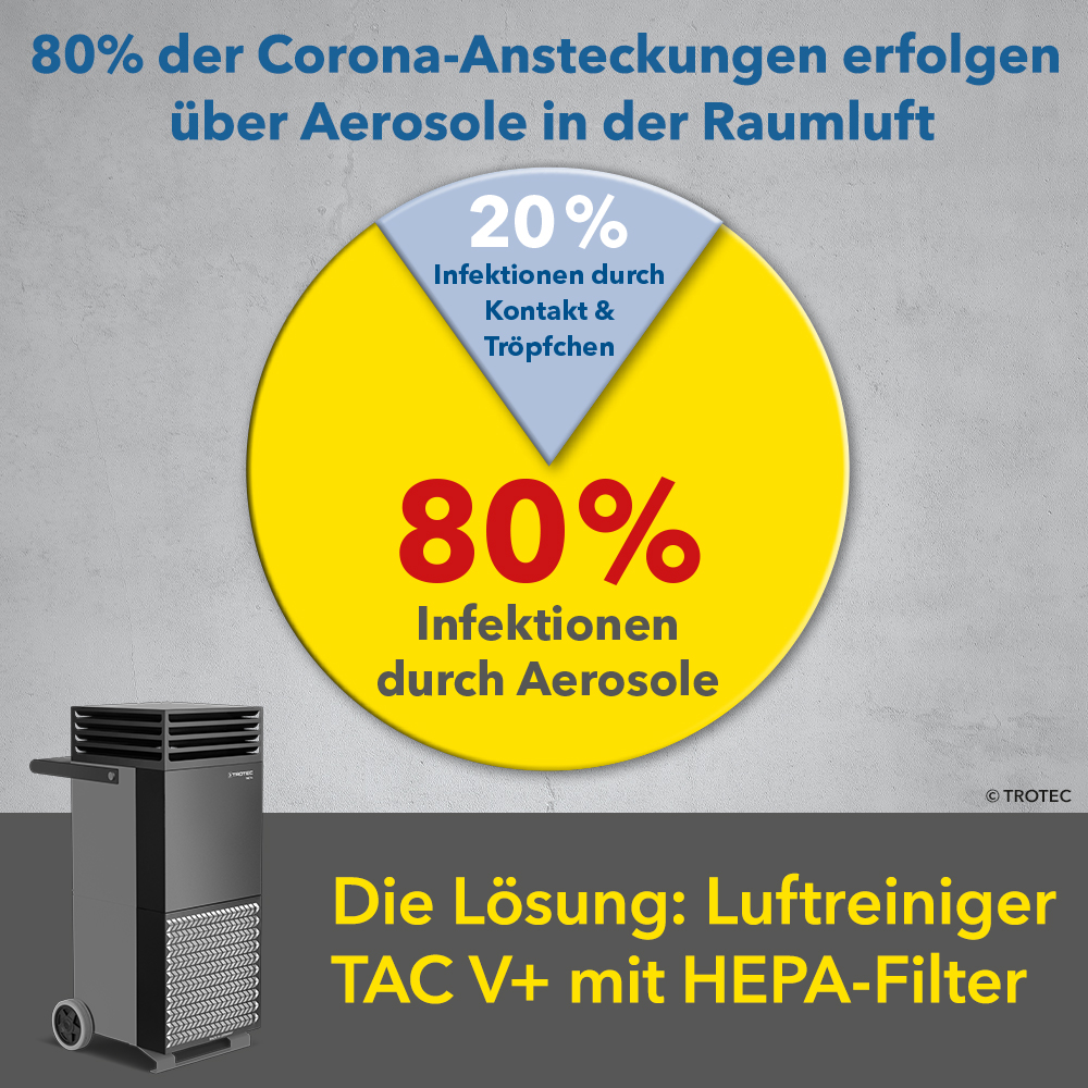 Eine Eingrenzung der Aerosol-Risiken ermöglicht der Hochfrequenz-Luftreiniger TAC V+ mit speziellem H14-Luftfilter, der bis zu 20 Mal/Stunde die Raumluft säubert.