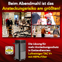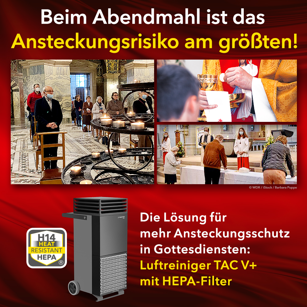 Einen Schutz vor infektiösen Aerosolen auch in Gottes- und Gebetshäusern mahnt der Virologe Prof. Dr. Thomas Mertens an, der beim RKI auch Mitglied der Arbeitsgruppe „SARS-CoV2“ ist. So müssten Priester bei der Austeilung der Kommunion dazu verpflichtet werden, strikt darauf zu achten, dass sich die Empfänger nicht durch ihre Atemluft infizieren könnten. Möglich wird dies durch den neuartigen Hochfrequenz-Luftreiniger TAC V+ von Trotec. Der Luftreiniger filtert infektiöse Aerosole schnell und effektiv aus der Raumluft – bevor diese über die Atemwege in den Körper gelangen.
