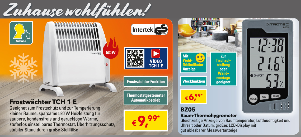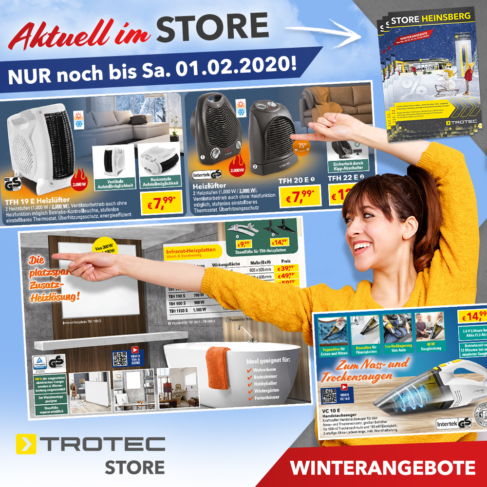 *Die Artikel liegen in begrenzter Menge vor und können daher bereits am ersten Aktionstag ausverkauft sein. Abgabe nur an Endverbraucher in haushaltsüblichen Mengen. Die Aktions-Preise sind exklusiv nur bis Sa., 01.02.2020 bei Trotec vor Ort in Heinsberg gültig. Alle Preise inkl. MwSt. Für Schreibfehler keine Haftung.