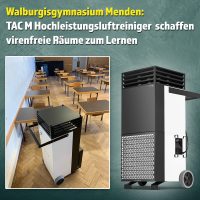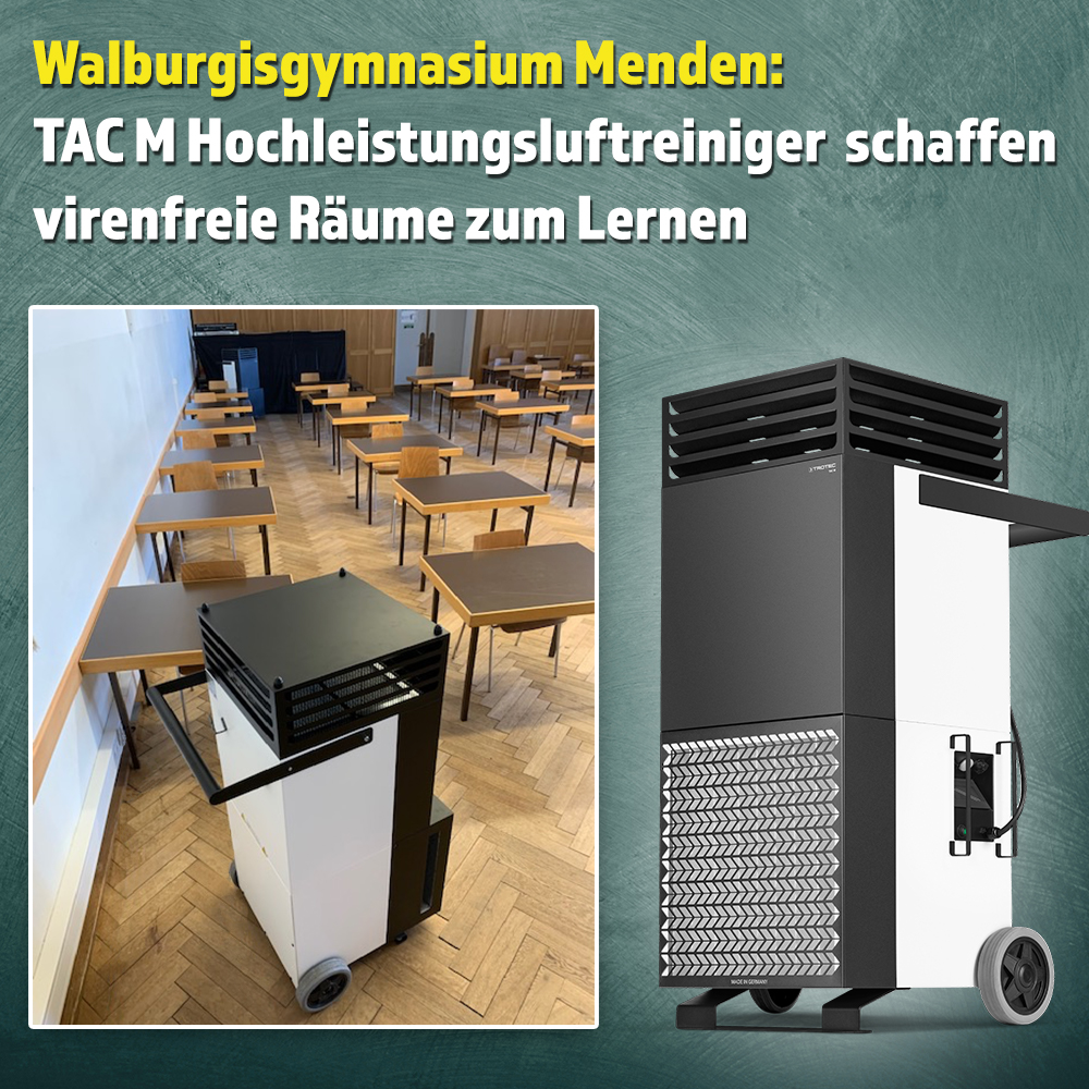 Wenn der Unterricht aufgrund der Abstandsregelungen beispielsweise in größere Klassenräume oder Säle verlegt werden muss, dann kommt der TAC Hochleistungsluftreiniger einfach mit. Das stabile und kratzfeste Metallgehäuse des mobilen Luftreinigers wurde speziell für den Einsatz in wechselnden Umgebungen konzipiert, in denen sich viele Personen gleichzeitig aufhalten und gemeinsam lernen oder arbeiten. Durch die komfortable Ausstattung mit Rollen und Schubgriff können die Geräte im Walburgisgymnasium ohne Krafteinsatz und Installationsaufwand überall dorthin bewegt und eingesetzt werden, wo sie gerade benötigt werden. Dadurch lassen sich immer genau so viele TAC Luftreiniger vorhalten, wie im Hygienekonzept gefordert werden – variabel angepasst an Belegungsdichte, Sicherheitsniveau, Geräuschkulisse, Raumgröße und -geometrie.
