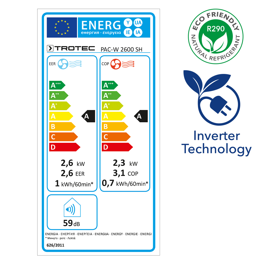 Und das erfreulich sparsam! Als Gerät der Energieeffizienzklasse A (im Kühlbetrieb) bzw. Energieeffizienzklasse A+ (Heizbetrieb) kühlt und heizt das PAC-W 2600 SH vergleichsweise verbrauchsarm. Klimaanlagen mit Inverter-Technologie verbrauchen bis zu 30 % weniger Energie als herkömmliche Anlagen ohne Invertertechnik!