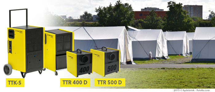 Wir sehen also, dass das Beheizen von Zelten und Containern alleine nicht ausreicht, um deren Bewohnern ein akzeptables Raumklima zu sichern. Vielmehr müssen, damit die von den Bewohnern produzierte Luftfeuchtigkeit signifikant reduziert werden kann, parallel zur Beheizung professionelle Luftentfeuchter zum Einsatz kommen. Dabei reicht es zur Vermeidung von tropfenden Decken aus, bei 10 °C Außentemperatur die Luftfeuchtigkeit von 70 % auf 55 % und bei 5 °C Außentemperatur auf 40 % zu reduzieren. Für diese effektive Zelt- und Container-Entfeuchtung bietet unser Unternehmen zwei alternative Lösungen an: