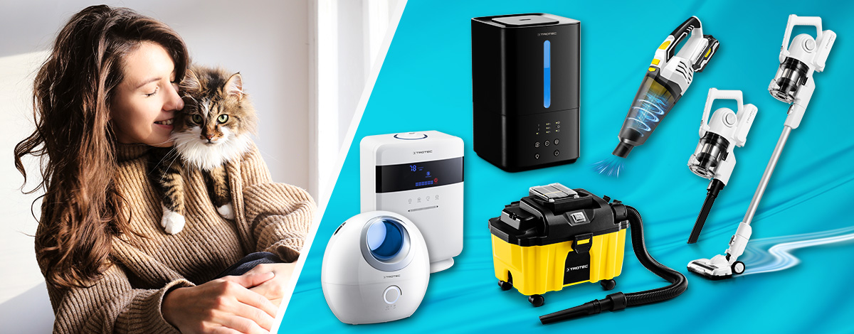 So liebenswert Fellnasen auch sind – sie hinterlassen ihre Spuren. Unschöne Tierhaare auf Möbeln und Kleidungsstücken lassen sich mit leistungsstarken Trotec-Staubsaugern schnell und gründlich beseitigen. Auch Katzenstreu auf Teppich, Fliesen oder Laminat ist mit der cleveren Kombination aus kabellosem Stiel- und kompaktem Handstaubsauger im Handumdrehen verschwunden. Tiergerüche entfernen? Ein Klacks für unsere Luftreiniger mit Geruchsbeseitiger. Duftmarken und strenge Gerüche in der Nähe des Katzenklos werden vollautomatisch neutralisiert.