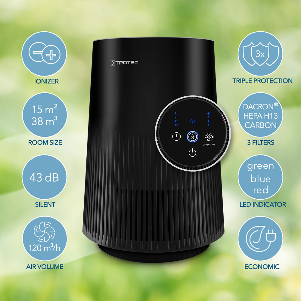 Ein hochwertiger 3-in-1-HEPA-Filter (bestehend aus HEPA-, Carbon- und Vorfilter) filtert bis zu 99,97 Prozent aller Partikel mit einer Größe von bis zu 0,3 µm aus der Raumluft – die Größe der häufigsten luftgetragenen Schadstoffe wie Viren sowie Bakterien. Sobald die Luft den Filter durchströmt, wird aus belasteter Raumluft saubere HEPA-gefilterte Reinluft, frei von krankmachenden Schadstoffen. Und das vollautomatisch dank modernster Staub- und Luftqualitätssensoren, mit denen die Luftqualität fortlaufend gemessen und Veränderungen erkannt werden – um dann mit einer intelligent geregelten Luftreinigungsleistung gegenzusteuern. Ergänzt wird die Luftreinigung durch eine Ionisierung der umherschwebenden Grobpartikel (Tierhaare, Pollen und Staub), wodurch diese zu Boden sinken, um vom Luftstrom des AirgoClean® 11 E angesaugt und im Vorfilter abgefiltert zu werden. Das dreistufig regelbare Gebläse mit einer maximalen Luftumwälzung von 120 m³/h ermöglicht eine spürbare Verbesserung der Luftqualität in Räumen bis zu 15 m² bzw. 38 m³.