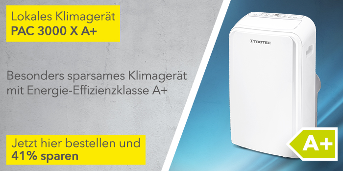 Profitieren Sie von der Trotec-Markenqualität als Garant für hohe Wertigkeit, Sicherheit und Funktionalität. Bestellen Sie am besten noch heute das Klimagerät PAC 3000 X A+ zu unserem aktuellen Angebotspreis – jetzt im Trotec-Shop!
