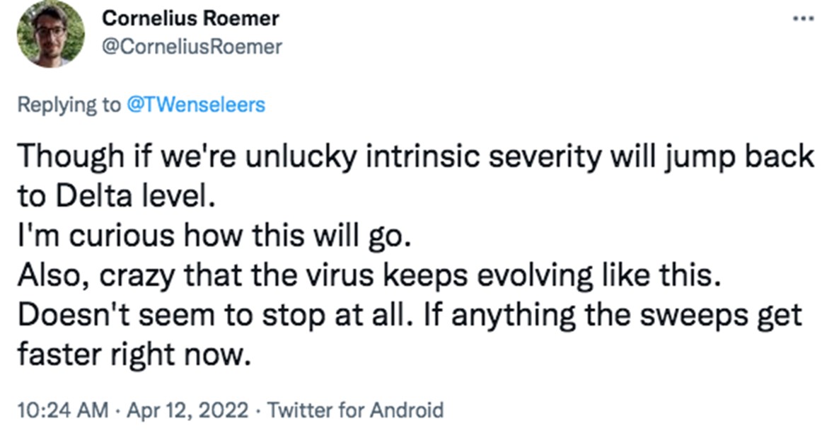 Die WHO stuft die neuen Omikron-Varianten BA.4 und BA.5 als besorgniserregend ein. Beide Varianten haben offenbar Mutationen, deren Auswirkungen auf infizierte Personen noch unklar sind. Cornelis Roemer, Biophysiker an der Universität Basel, schreibt dazu auf Twitter: „Wenn wir Pech haben, wird die Schwere der Verläufe wieder so schlimm wie bei Delta.“ In diesem Fall wären die Varianten BA.4 und BA.5 ein Rückschritt in die Zeit vor der Omikron-Variante – mit schwereren Krankheitsverläufen.