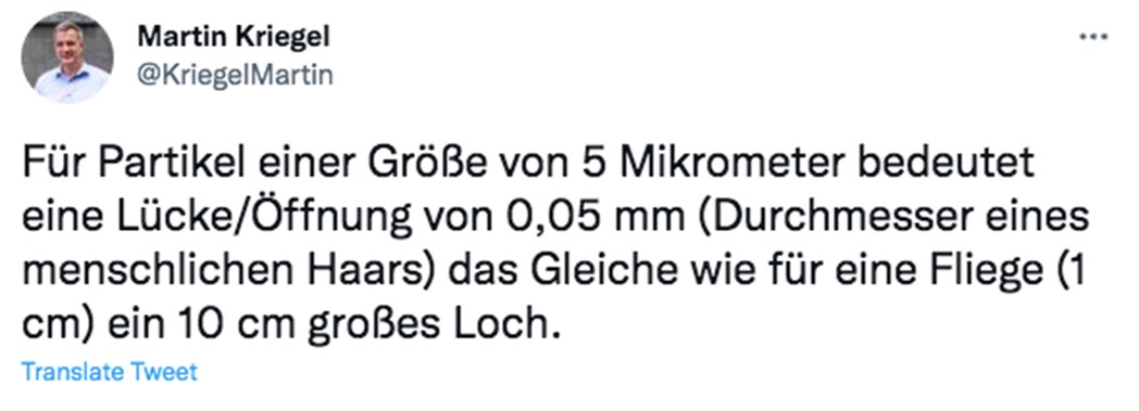 „Für Partikel einer Größe von 5 Mikrometer bedeutet eine Lücke/Öffnung von 0,05 mm (Durchmesser eines menschlichen Haars) das Gleiche wie für eine Fliege (1 cm) ein 10 cm großes Loch.“, warnt Dr.-Ing. Martin Kriegel, Leiter des Hermann-Rietschel-Instituts an der TU Berlin, in einem aktuellen Tweet auf Twitter.