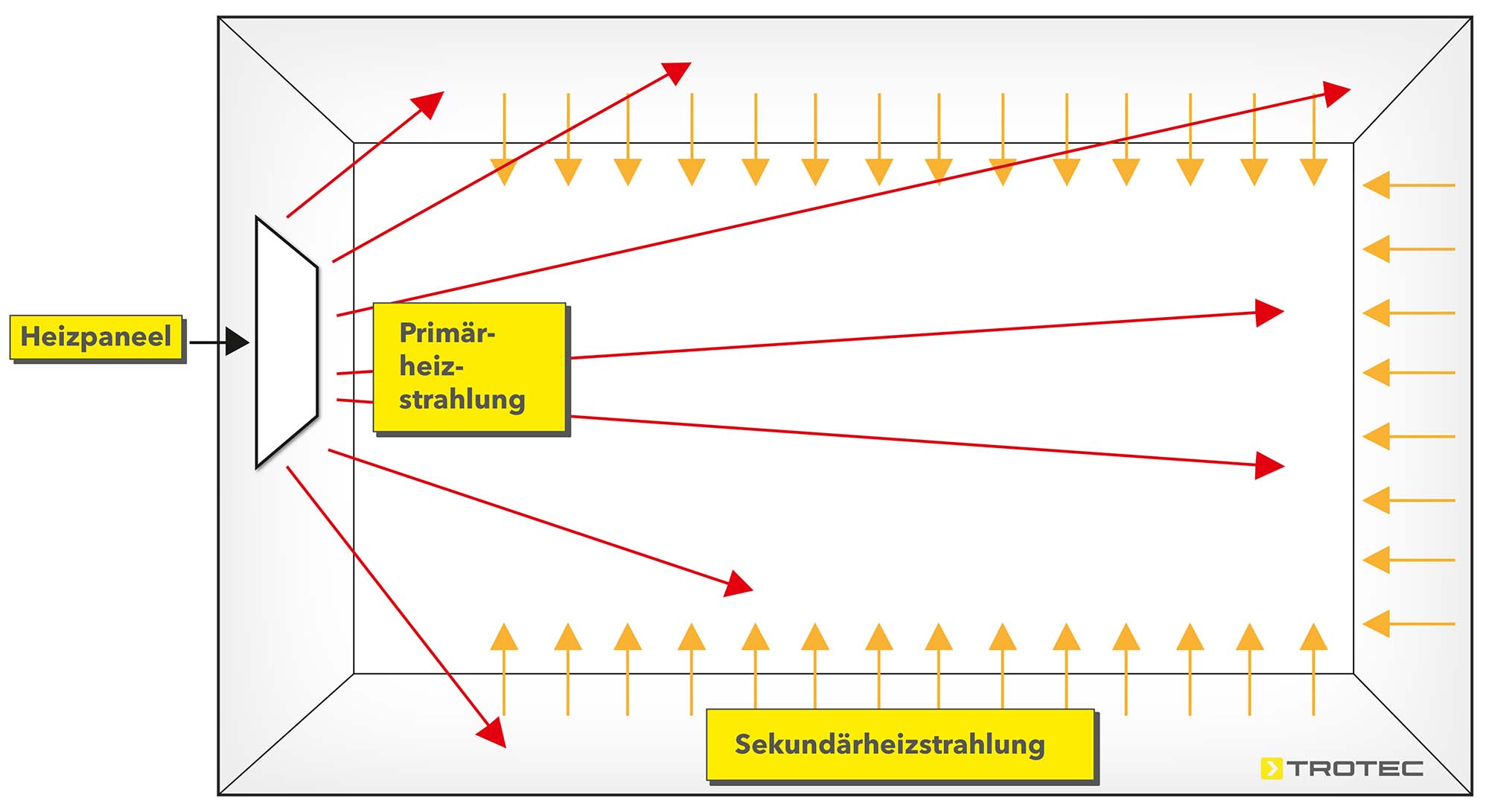 Heiztechnik: Heizstrahler mit Infrarot-Technik beheizen die direkte Umgebung nach dem natürlichen Prinzip der Sonne. Im Gegensatz zu Geräten mit Heizdrähten erwärmen Infrarotstrahlen nicht die Umgebungsluft, sondern ausschließlich Oberflächen und Personen, auf die sie treffen. Die angestrahlten Objekte (zum Beispiel Mobiliar, Wände und Decken) nehmen die Wärme auf und speichern diese, um sie dann nach und nach wieder in den Raum abzugeben. Die Objekte dienen somit selbst bei ausgeschaltetem Heizgerät als zusätzlicher Energie- und Wärmespeicher, was den Wirkungsgrad von Infrarotstrahlern zusätzlich erhöht.