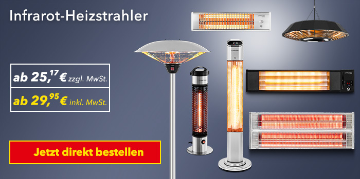 Moderne Infrarot-Heizstrahler und Infrarot-Heizplatten, mit Heizleistungen von 200 Watt bis 2.000 Watt, sind bei Trotec bereits ab 29,95 € erhältlich. Wer maximale Flexibilität beim Einsatz des Heizgerätes bevorzugt, findet in den leicht auf- und umstellbaren Trotec-Standheizstrahlern mit bis zu 3.000 Watt Heizleistung eine moderne und äußerst energieeffiziente Heizalternative.