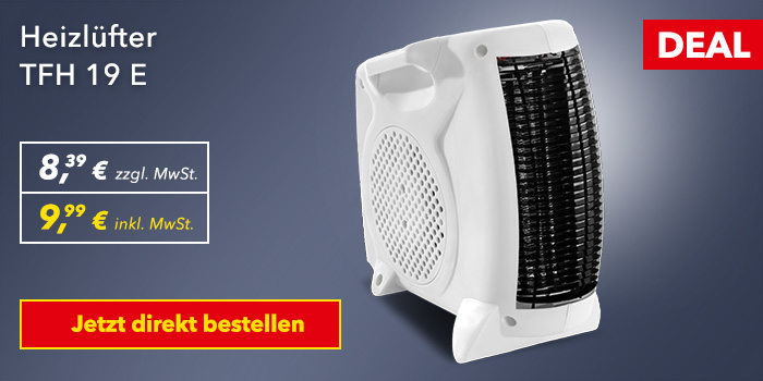 Diese Woche als Trotec-Deal besonders günstig: Heizlüfter TFH 19 E. Für nur 9,99 € sorgt der kompakte Schnellheizer mit zwei Heizstufen (1.000 W/2.000 W) für eine schnelle Erwärmung kühler Räume. Ein stufenlos einstellbarer Thermostat hält die Heizkosten im Griff. Das Gerät heizt nur so lange, bis die gewünschte Zieltemperatur erreicht ist. Danach schaltet sich das Heizgerät vollautomatisch ab und erst dann wieder an, wenn ein Nachheizen erforderlich wird.