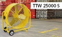 Die TTW 25000 S ist als Trommelventilator zur mobilen Luftumwälzung konzipiert und kombiniert solide Technik und hohe Luftleistung mit einem optimalen Preis-Leistungsverhältnis. Die steckerfertig einsetzbare Windmaschine überzeugt durch ihre hohe, zweistufig regelbare Luftleistung von bis zu 27.600 m³/h. Die TTW 25000 S ist optimal einsetzbar, ob zur Geruchsentlüftung in Landwirtschaft und Produktion, zur Zeltbelüftung, zur unterstützenden Luftumwälzung in Vollgutlagern oder zur temporären Unterstützung von Kühl- oder Heizanlagen bis hin zur flexibel einsetzbaren Lösung bei Effektbelüftungen für Bühne, Film- und Fotosets.