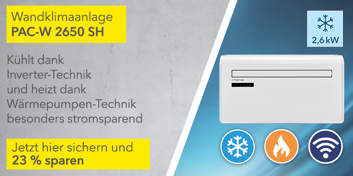 - Energieeffizienter Betrieb: Das 2-Kanal-Monoblock-Klimagerät PAC-W 2650 SH von Trotec arbeitet rund viermal effizienter als getestete 1-Kanal-Monoblock-Geräte.
