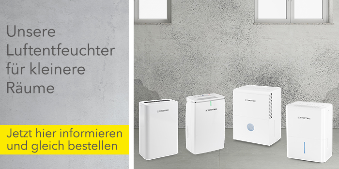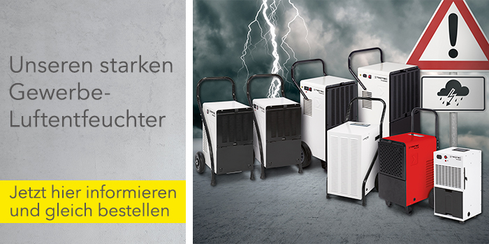 Für Bereiche, die nicht direkt vom Wassereinbruch betroffen sind, eignen sich schon recht kleine Kondenstrockner mit nur geringem Stromverbrauch. Diese Geräte sind für eine sehr effiziente Entfeuchtung und den Einsatz bei Temperaturen zwischen 15 °C und 20 °C optimiert. Dazu gehören beispielsweise der TTK 26 E, TTK 28 E, TTK 30 E und TTK 32 E für Raumgrößen bis 15 m², sowie TTK 52 E und TTK 53 E bis 25/31 m² und der TTK 72 E bis 50 m².