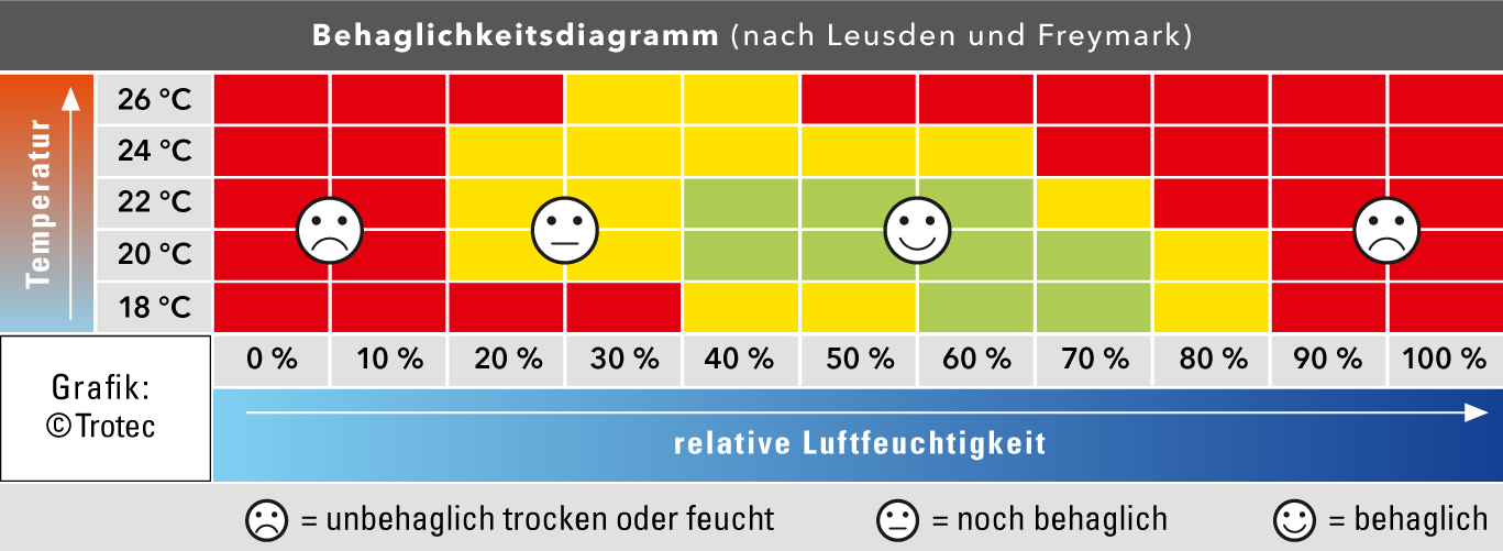 Das Behaglichkeitsdiagramm zeigt den Wohlfühlklimabereich an
