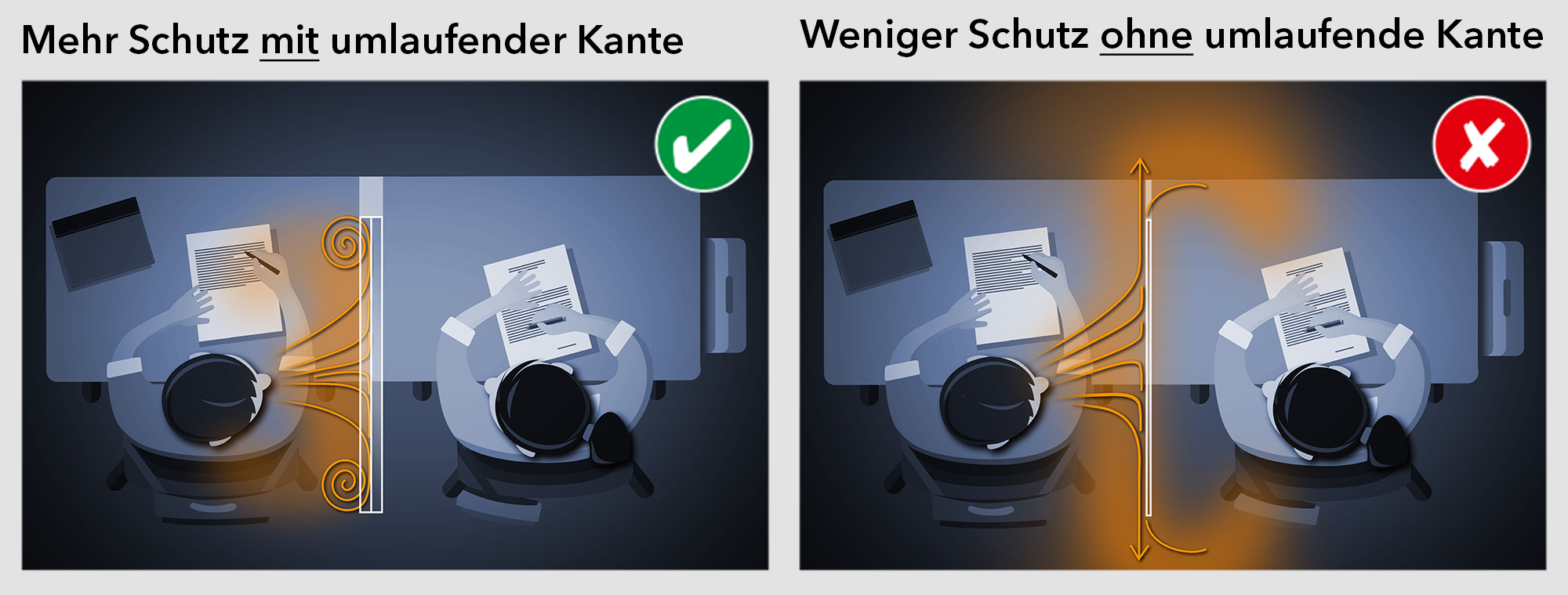 Die besondere Form der Aerosol-Schutzkante sorgt dafür, dass auftreffende Aerosolpartikelströme zweimal um 90° umgelenkt werden. Der dadurch entstehende Wirbel fängt die Aerosolpartikel ein und schützt so die Sitznachbarn, da die ausgestoßenen Aerosolwolken nicht ungehindert in den Raum zu benachbarten Sitzreihen strömen oder um die Schutzwand herum zum Nachbarn herübertreiben.