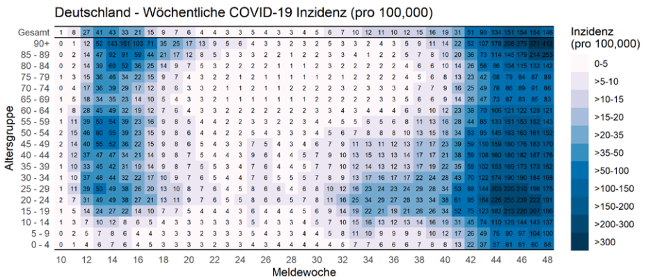 Abbildung: Darstellung des 7-Tage-Inzidenz der COVID-19-Fälle in Deutschland nach Altersgruppe und Meldewoche (n=1.060.163 Fälle mit entsprechenden Angaben in den Meldewochen KW10-48; Stand 01.12.2020, 0:00 Uhr).