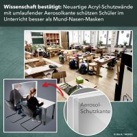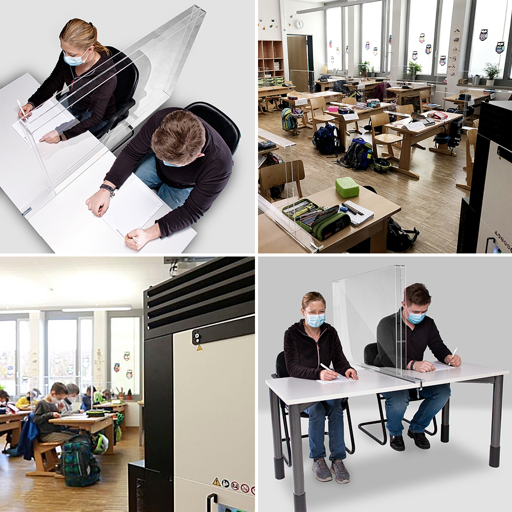 Die Schutzwände mit Aerosol-Schutzkante sind in verschiedenen Formen und Größen erhältlich, um auch an den Tischen des Lehrpersonals sowie an Gruppen-Arbeitstischen einen hohen Schutz zu gewährleisten. Sie schirmen SchülerInnen und LehrerInnen zuverlässig ab und verbessern den Schutz vor einer Infektion durch umherfliegende Tröpfchen und Aerosolgemische. Die aus jedem Blickwinkel durchsichtigen Trennwände ragen über den Tischrand hinaus und bilden so zwischen den Schülern eine wirksame Barriere. Durchgängig abgerundete Ecken verhindern, dass sich die Schülerinnen und Schüler verletzen können. Im Gegensatz zu minderwertigen Acrylglasplatten, die häufig durch die regelmäßige Reinigung „blind werden“ oder vergilben, bieten die aus hochwertigem RÖHM-Acrylglas gefertigten Schutzwände stets eine glasklare freie Sicht auf Lehrer und Tafel.