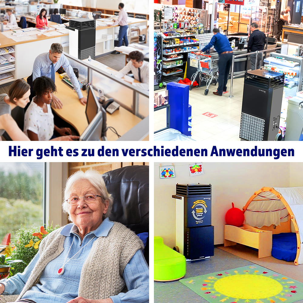 „Raumluftreiniger und Filter sind überall dort zu installieren, wo Menschen sich länger in geschlossenen Räumen aufhalten müssen (Wohnheime, Schulen, Alten- und Pflegeheime, Betreuungseinrichtungen, Büros und andere Arbeitsplätze).“
