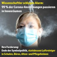 Führende Wissenschaftler aus der Aerosolforschung schlagen Alarm! Sie fordern in einem offenen Brief – adressiert an die Bundeskanzlerin Angela Merkel, die Ministerpräsidenten und Ministerpräsidentinnen der Länder, den Bundesgesundheitsminister Jens Spahn sowie die Gesundheitsminister und Gesundheitsministerinnen der Länder – ein Umdenken in der Corona-Politik. Die von der Regierung präferierten Maßnahmen, beispielsweise das Tragen von Masken im Freien, hätten lediglich einen symbolischen Charakter, sie würden aber „keinen nennenswerten Einfluss auf das Infektionsgeschehen erwarten lassen“.