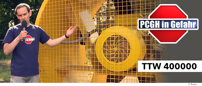 PCGH in Gefahr, der offizielle YouTube-Kanal von PC Games Hardware, geht für spannende PC-Experimente stets volles Risiko. Weil dabei das Thema ‚Kühlung‘ häufiger im Fokus steht, war es nur eine Frage der Zeit, bis das Team von PCGH in Gefahr den mutmaßlich weltweit größten mobilen Lüfter für ihre Show entdeckt: den 90.0000 Watt-Lüfter TTW 400000 von Trotec. Showtime: Schafft es der 2,8 Tonnen schwere Axialventilator den 8-Kern-Prozessor Ryzen 7 1800X von AMD allein mit seinem Luftstrom zu kühlen?