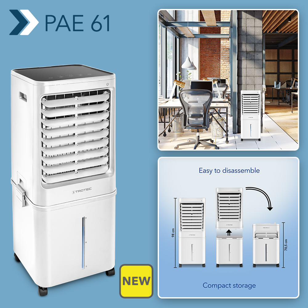 The summer ahead is going to be a sweaty one. But with just one click you can save yourself from the heat with an ice-cool airflow. That’s because the Air Cooler PAE 60 is finally available for delivery from the Trotec Online Shop, which cools overheated rooms down to a pleasant temperature in the blink of an eye. What’s more, the powerful 4-in-1 device refreshes, cleans and humidifies the air too. And because this is all done by such an elegant and smooth matt black device, it also looks great in your home, office, or café. So, make the heatwave more comfortable now – with just one click!