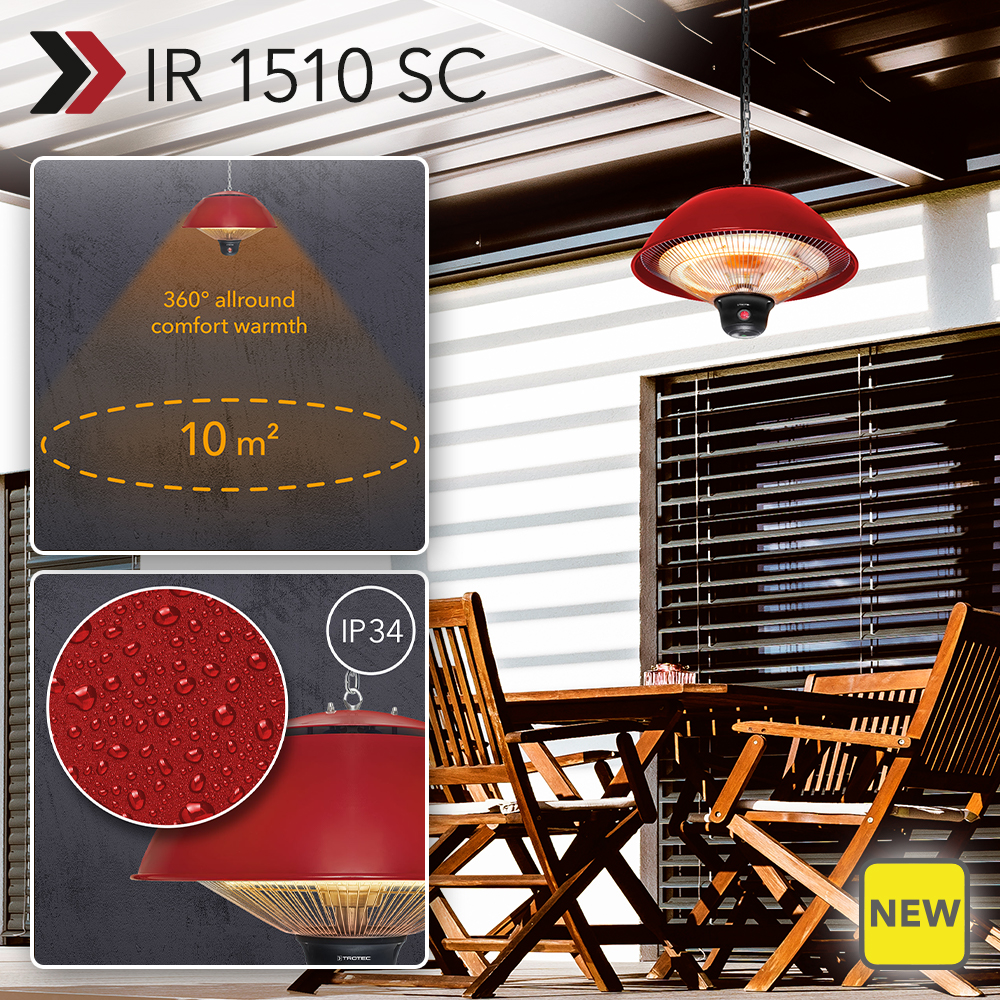 Just as any owner of a terrace or balcony would, you’ve probably been looking forward to a few weeks of summer with plenty of sun and BBQs – and now this! It’s cool again! And getting cooler! Since we won’t get back those days we lost, it’s about time to bring back the warmth. The method of choice: the new, finally available IR 1510 SC Design Radiant Ceiling Heater from Trotec. It will grant you complete independence from the whims of the weather and from outdoor temperatures – with as much cosy warmth as is comfortable for your guests at just the push of a button. A real eyecatcher in carmine red – at an unbeatable price.