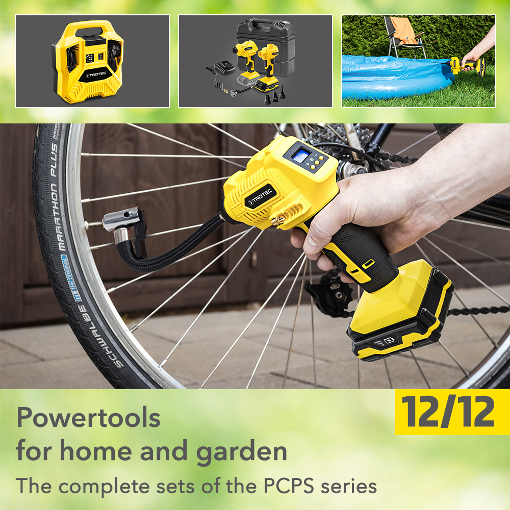 Are your car or bike tyres out of air? Or perhaps your paddling pool or inflatable dinghy needs deflating instead? The solution for this and for other inflation-related problems is the new complete set from Trotec: The carrying case contains the PCPS 11‑20V cordless compressor and PCPS 12‑20V cordless air pump. Two reliable, professional assistants that you will be glad to have at your side the next time you want to pump a lot of air in or out at high pressure.