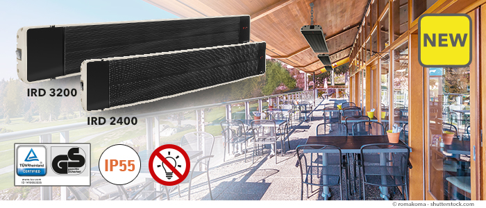 Feel the dark side of heat! The new IRD 2400 and IRD 3200 dark radiant heaters are now available for delivery – they generate infrared heat while dispensing with the otherwise visible and brightly shining heating tube used in conventional devices. So if you want to sit comfortably in the dark and in the warmth, take a closer look at this elegant solution for architecturally sophisticated indoor and outdoor areas following the Master Yoda principle: “Forget you must what learned you have!”
