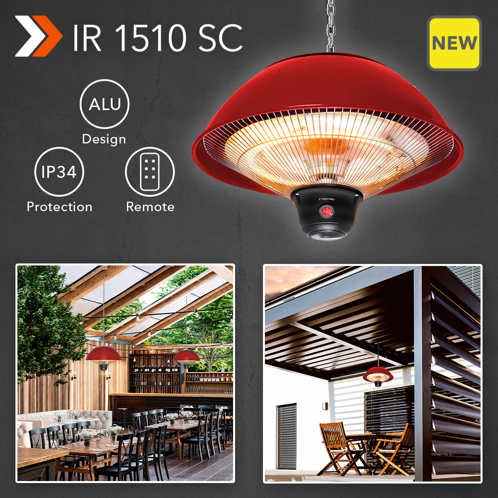 Whether you want to celebrate the Euros on your patio, or just want to have a good time – because who knows how warm it will be in a few days? Especially in the evening, it tends to get cooler and cooler very quickly. No football fan or guest needs that! As a pleasant warmth is so essential for an atmospheric ambience on your patio at home, on the balcony, in your tent or in the garden pavilion, you should not have to rely on the temperature outside . The IR 1510 SC infrared ceiling heater provides summer temperatures in outdoor areas all year round – and is also a real eye-catcher thanks to its carmine-red reflector screen.