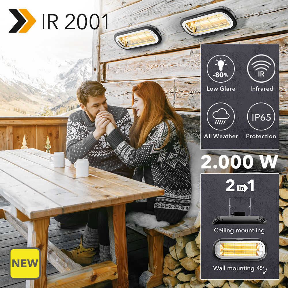 We can take pots of coffee outside for longer now. On the balcony, the terrace or even in outdoor areas in the catering trade. With the new IR 2001 design infrared radiant heater, shivering on chilly days is a thing of the past. Mounted on the wall or ceiling, a full 2,000 watts of infrared heating power guarantee summer temperatures without preheating. The high-quality, low-glare infrared tube reduces the light intensity by up to 80%. And thanks to the housing designed according to protection class IP65, the compact infrared heater is reliably protected from wind and rain. We’ll gladly take another full cup of coffee …, uh pot!