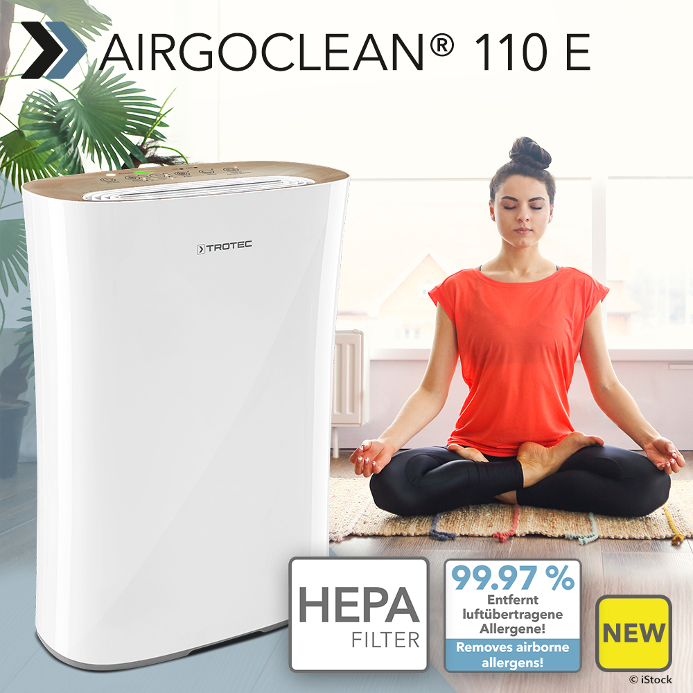 What does a healthy life consist of? Health experts consistently answer this question with the following: a balanced diet, sufficient exercise, restful sleep and, of course, clean air to breathe. But indoor air is rarely clean! Viruses and bacteria, fine dust and house dust, pollen, allergenic spores and mites make life difficult for us. The more we breathe them in, the more noticeable the effects on our well-being. This is why we recommend the new AirgoClean® 110 E design air purifier: with its 3-stage powerful HEPA filter air purifier, it cleans 99.97% of airborne pollutants from the air.