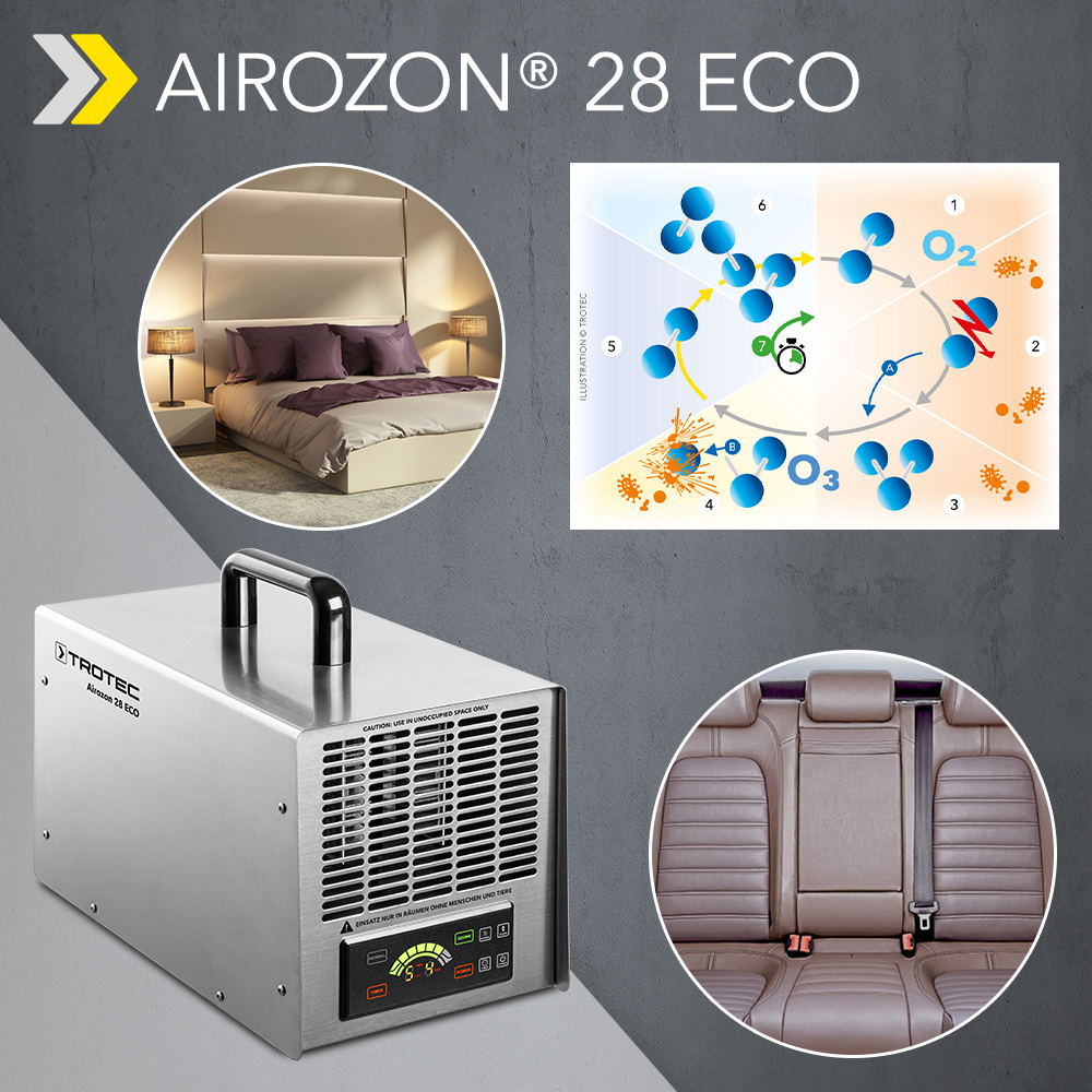 Many unpleasant odours penetrate so deeply into textiles and upholstery that it seems impossible to eradicate them, no matter how much you ventilate the room. However, as a professional service provider, you know that germ-free interiors with a fresh air smell are much easier to sell. So the Airozon® 28 ECO ozone disinfector from Trotec, which is now back in stock, should be an integral part of your company’s pool of cleaning machines. This is because its ozone treatment enables not only the effective elimination of unpleasant odours but also the eradication of micro-organisms such as bacteria, mould spores and viruses on surfaces and in the room air.