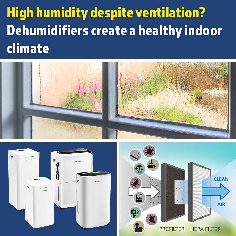 Whether at home or at work: regular ventilation and appropriate heating help to improve the indoor air, prevent the risk of mould growth and create an overall healthier indoor climate. But what can be done if the air humidity remains too high despite regular ventilation? Experts recommend mobile dehumidifiers, that provide optimally humidified room air fully automatically and even clean it.