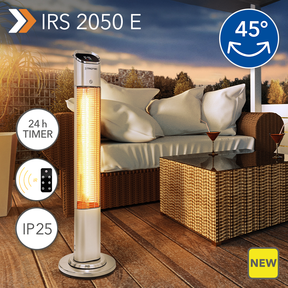 The list of questions is overwhelming: What can you and can’t you do? Are you vaccinated, immune, have you been tested? How are things looking for that holiday abroad you were planning? And what can we expect come autumn? With all the uncertainty, we can at least put your mind’s at rest, patio and balcony owners, and give you a definite answer to the last question: Warm and happy days lie ahead! Because the aesthetically appealing IRS 2050 E infrared radiant heater provides you with exactly the right feel-good warmth you need to relax in peace on your patio, even on chilly days. The radiant heater not only impresses thanks to its stability, but also with numerous top-quality features – and, of course, its unbeatable price!