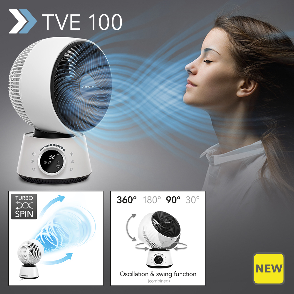 Raise your hand if you have ever ran near a fan to escape the heat of the last few summers. Raise both hands if you want to keep cool during the next heat wave! So, everyone else, please take a look at the new 360°-Turbo Fan TVE 100, which has just been delivered to us fresh from the future: with 32 speed levels, patented 360° swivel design and 90° swing function. But above all, with the latest turbo-spin technology for room-filling air circulation. It doesn’t matter where you are in the room – you will find the highly compressed, rotating and cooling airflow everywhere!
