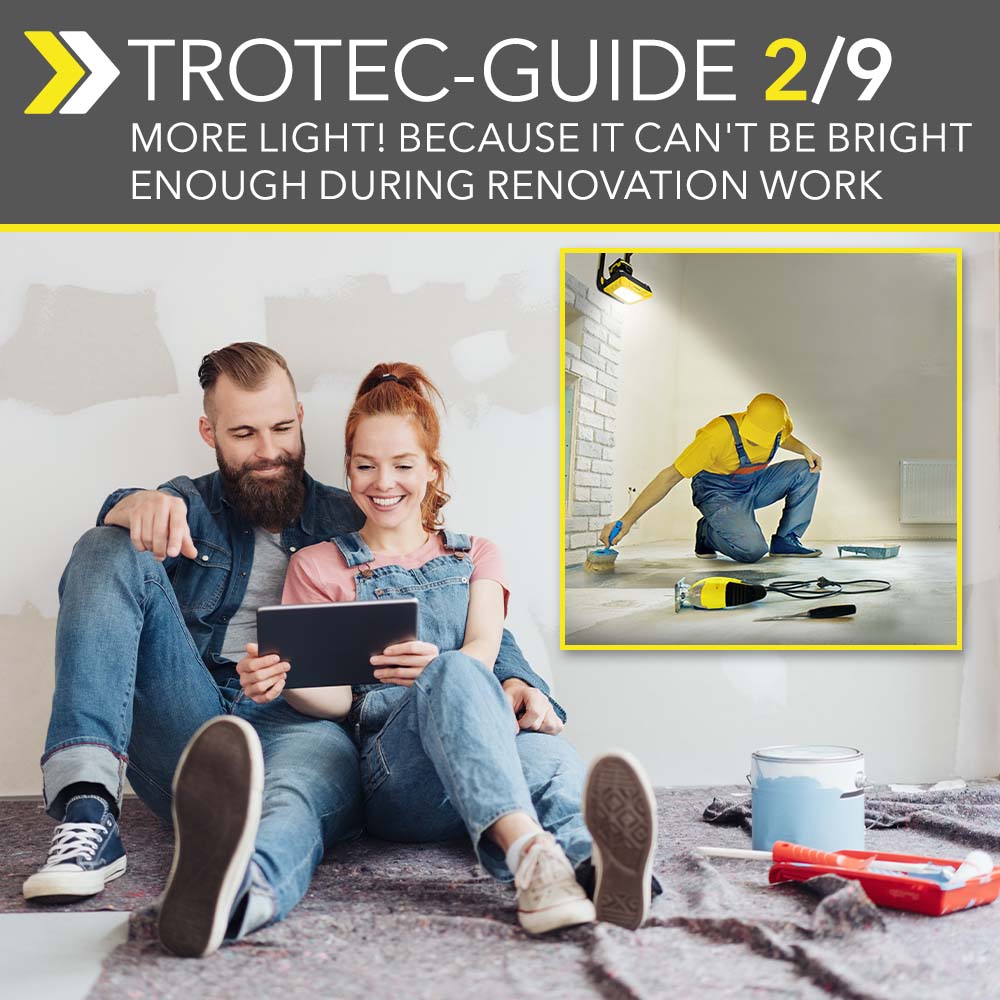 Rooms as bright as day during renovation, well-lit basement rooms for waterproofing work and clear visibility outdoors, even in the evening or at night – what handyman or craftsman would say no to that? That is why we at Trotec have specially developed a range of work lights which provide you with optimum lighting conditions at the push of a button. Whenever and wherever you want! Even for renovations where you have to manage without permanently installed lighting, our flexibly usable work lights provide you with the best view and plenty of light.