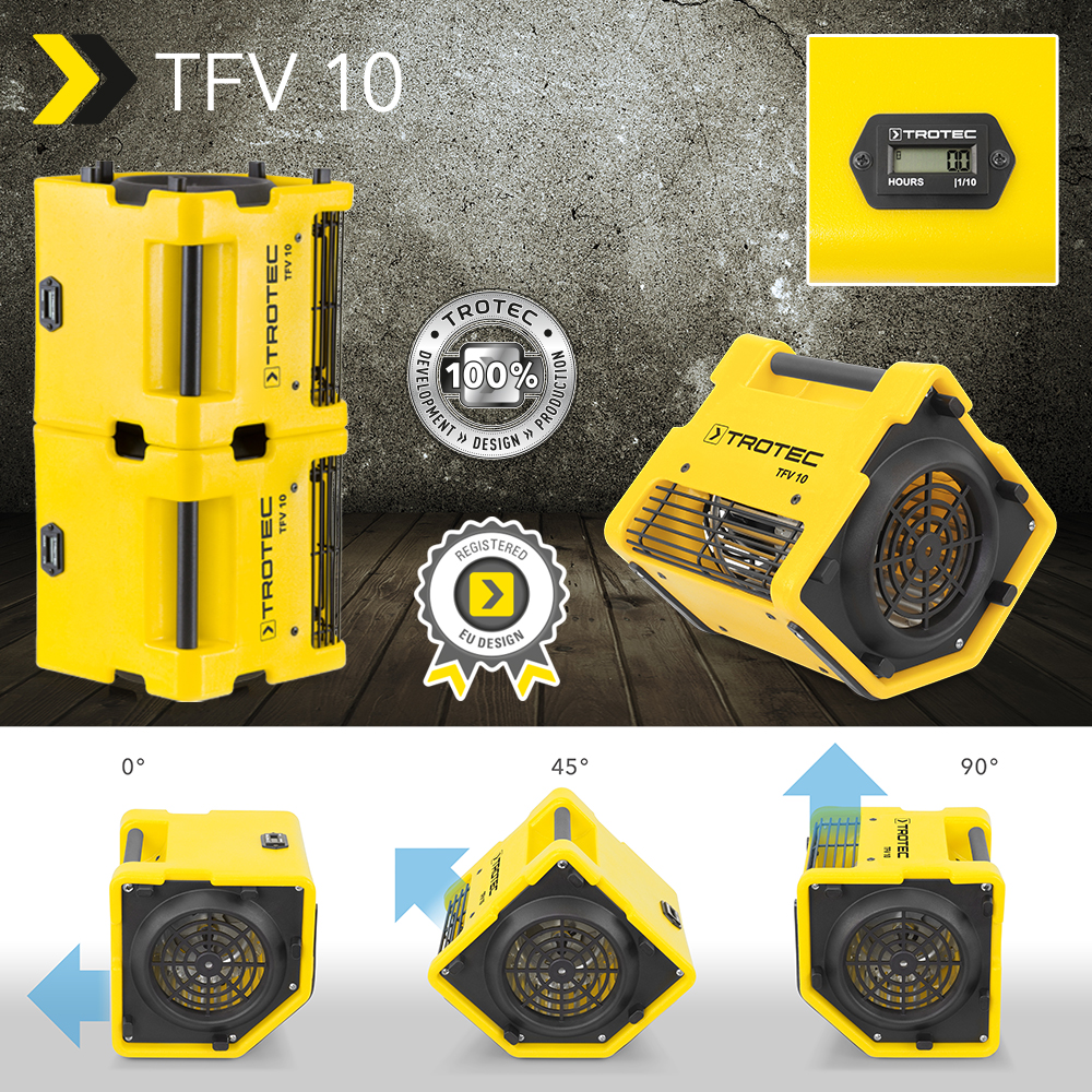Made by pros, for pros: The TFV 10 Turbofan, which is finally back in stock, is 100% Trotec in its development, design and production. This is not the only reason why its German industrial design, optimised for practical use, noticeably stands out amongst ordinary turbo fans. In fact, the pattern-protected design is the basis for numerous user benefits for professional applications. The housing is shaped in such a way that it can be operated in three different positions: horizontally, in 45° inclination and vertically, thus making it optimal for professional use on site.
