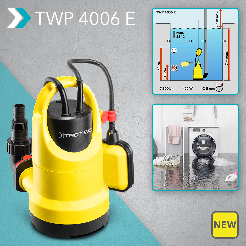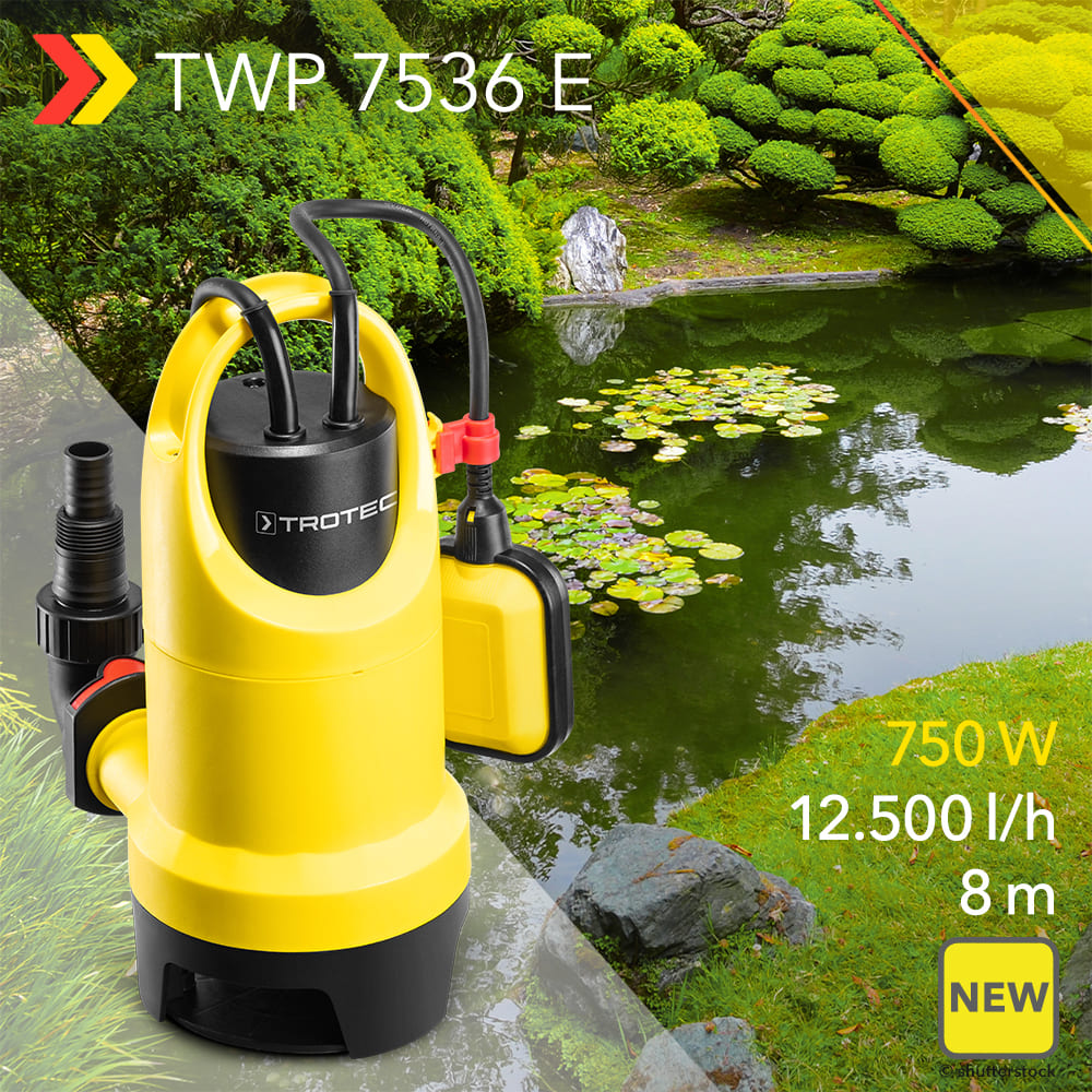 Don’t we all miss a clear sales guide on midsummer water supply issues in the garden from time to time? And, every now and then, straightforward announcements on which tools are best to pump out flooded basements again? Here you go: The 750 watt submerged pump TWP 7536 E is an indispensable helper for homeowners and hobby gardeners to quickly pump out or transfer large quantities of dirty water. Whether for using free service water from ponds, streams and rainwater cisterns for watering the garden or for pumping out the basement after heavy, continuous rain.