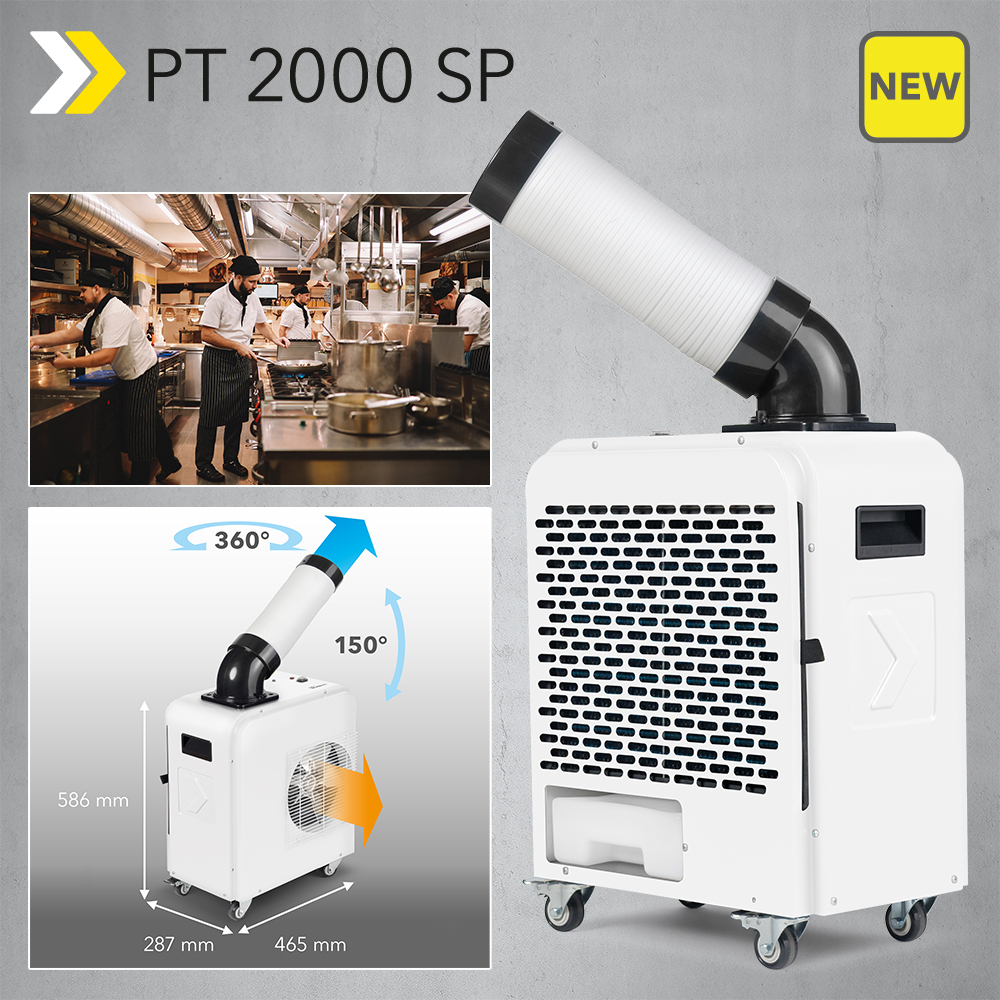 Anyone who leaves their air-conditioned office for a walk in the workshop or hall in summer knows what they are usually in for. Where there was pleasant coolness just a moment ago, there is often heat and stifling air just one or two doors down. That’s why the mobile PT 2000 SP spot cooler is the best choice for precise cooling applications in workshops, work halls, canteen kitchens and many other working environments. With sufficient cooling capacity and a correspondingly large air volume, the new Spotcooler is ready for use immediately and without any preparatory installation work – and is therefore the unerring solution for a cool working climate without heat stress.