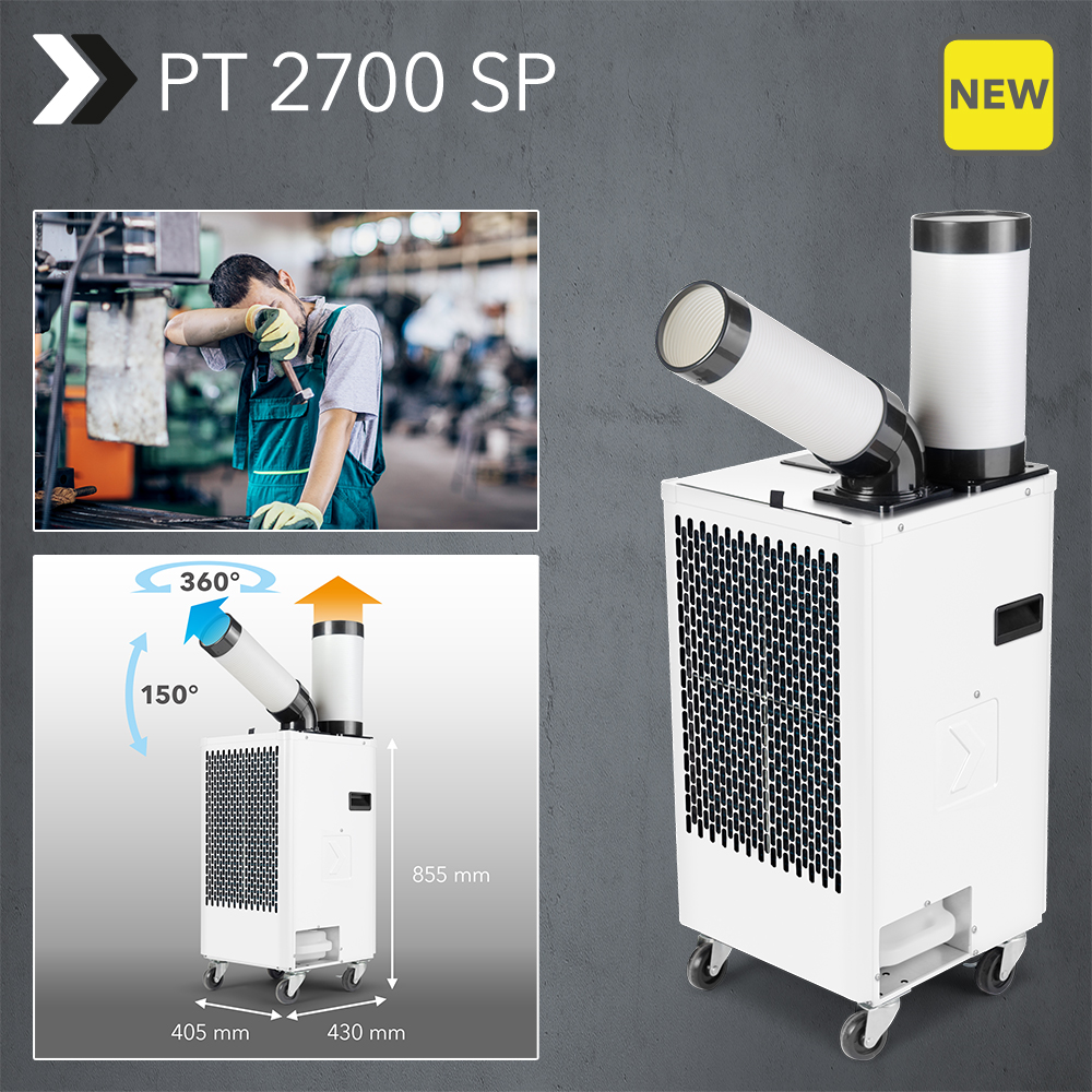 The workplace is not always a cool dream. If you think of server and network rooms, event rooms, welding work in the workshop or the blast furnace atmosphere in catering kitchens, you start to sweat yourself. That’s where the mobile spot cooler PT 2700 SP comes in handy, because it is the best choice for precise cooling applications in workshops, work halls, canteen kitchens and many other working environments. With sufficient cooling capacity and a correspondingly large air volume, this spotcooler is ready for use immediately and without any preparatory installation work – and is therefore the unerring solution for a cool working climate without heat stress.