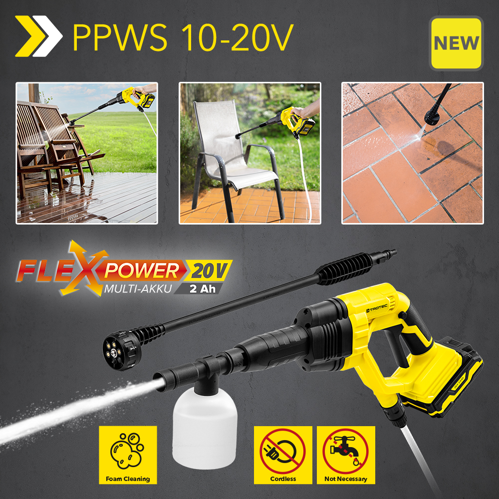 Trotec makes the difference – also with high-pressure cleaners. Because standard high-pressure cleaners require a power connection and only allow you to connect a garden hose. However, with our new cordless high-pressure cleaner PPWS 10-20V, which is finally available, you will not longer need a power socket or fixed water connection. On the one hand because of the 20V Flexpower multi-battery (2 Ah/4 Ah) from the proven Trotec multi-battery system. On the other hand, due to the integrated self-priming function, which, in addition to the connection of a garden hose, also enables the use of alternative water sources such as buckets, rain barrels, cisterns or wells.