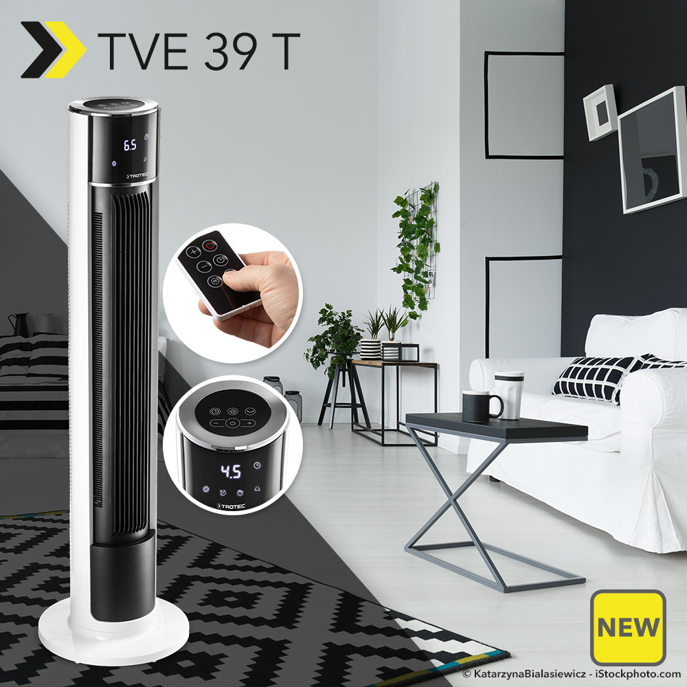 For all remote workers brooding at their desks. Or for all those who are silently sweating at the office. And for all those who want a kick of fresh air in their living room or bedroom: Pleasant cooling even as temperatures start to escalate on those hot summer days – is guaranteed by the new TVE 39 T design tower fan. The elegant and high-quality column fan comes in a stylish black and whitelook and likewise impresses in terms of convenience and quality. Just see for yourself …